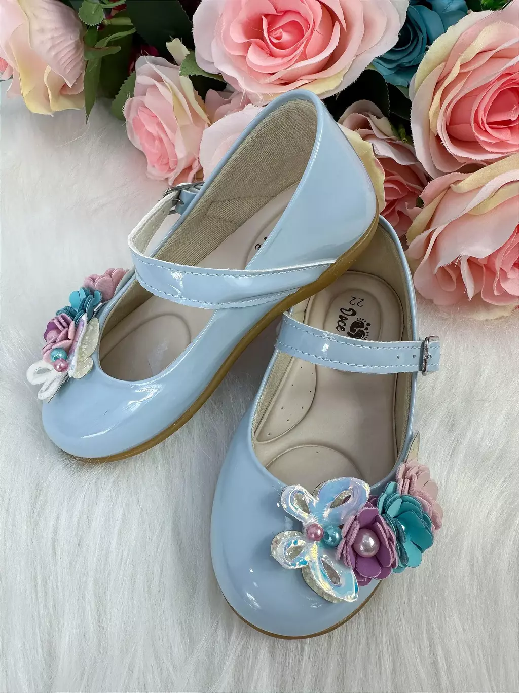 O design clássico é enriquecido por detalhes encantadores de flores e uma borboletinha, que trazem o toque mágico do jardim para os pés da sua pequena princesa.