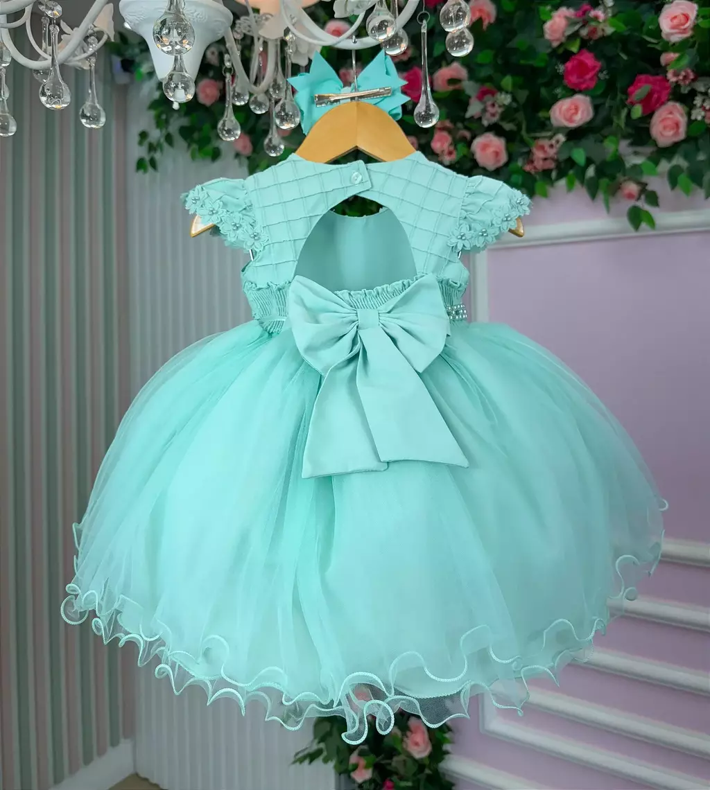 Encante sua pequena com o Vestido Bebê Julieta Verde Menta, uma peça que une conforto e sofisticação em cada detalhe!