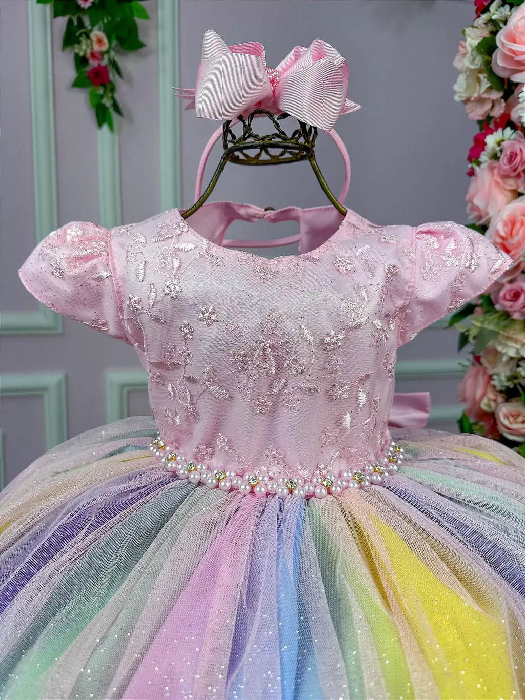 Os detalhes encantadores incluem apliques de concha, pérolas, flores e laços que remetem ao efeito de água-viva, além do elástico nas costas para um ajuste perfeito. O acabamento com um lindo laço na parte posterior completa o visual, tornando este vestido perfeito para temas como Arco-Íris, Circo, Candy Color e Jardim Encantado.